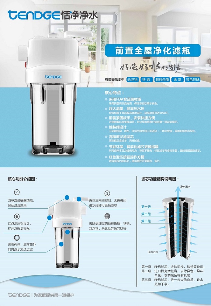 恬凈前置全屋凈化濾瓶TQ-P2能有效去除水中的懸浮物、鐵銹、顆粒雜質(zhì)、余氯、異色異味,它采用FDA食品級材質(zhì),高精度過濾濾芯,體積小巧,安裝方便。恬凈前置全屋凈化濾瓶TQ-P2能承受高水壓,流量超大,智能濾芯提醒功能,節(jié)能環(huán)保。