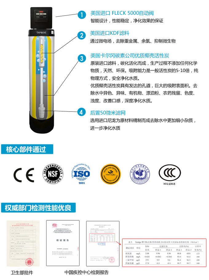 全屋中央凈水機有效去除水中的異色、異味;進一步濾除水中微小雜質(zhì)、膠狀體;去除水中的漂白粉余氯、農(nóng)藥、重金屬;保留對人體有益的礦物質(zhì)。使水變得碧清、碧藍,去除對人體有害的物質(zhì)。